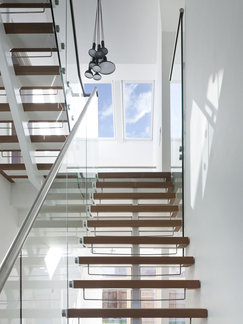 Un’altra soluzione a grappolo che utilizza diffusori di dimensioni diverse per illuminare le scale in modo originale. I parapetti in vetro permettono la diffusione della luce fino al piano inferiore.