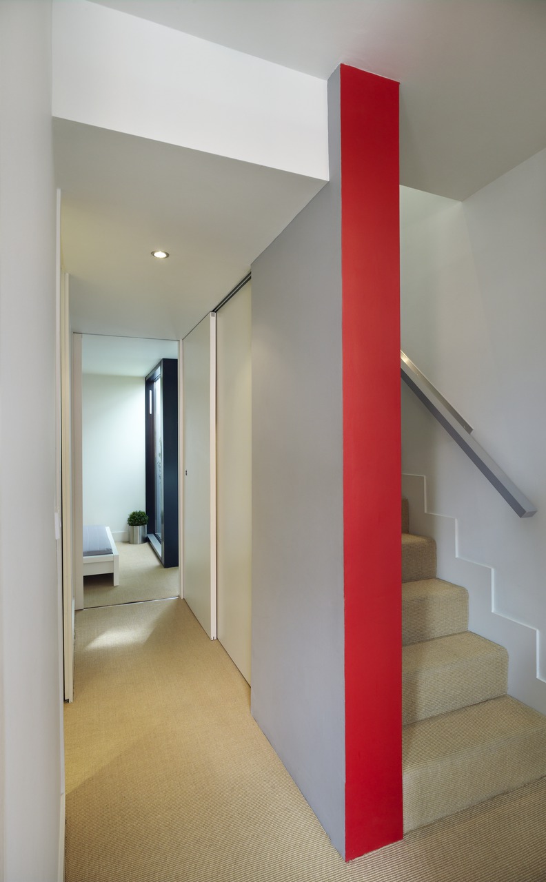 Un questo duplex, dove una scala porta al piano superiore mansardato, basta lo spigolo di una parete per trasformare un corridoio anonimo. Il bianco delle pareti e il crema del pavimento vengono illuminati da un rosso quasi fosforescente.
