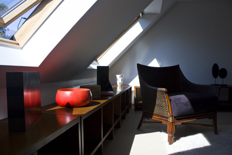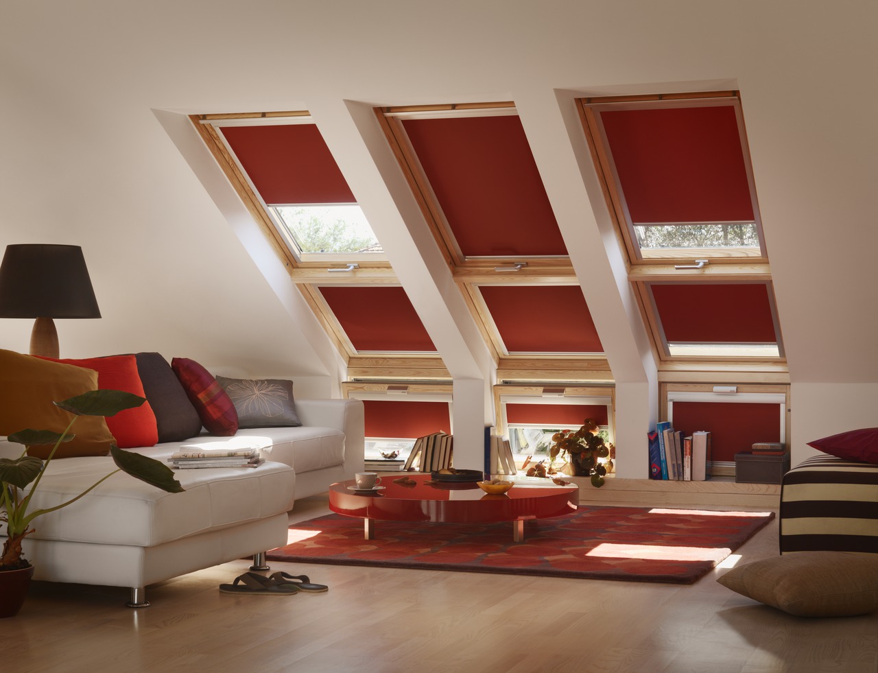 Questo salotto mansardato è illuminato da 9 finestre per tetti. Per creare un’atmosfera intima e schermare la luce diretta del sole, sono state inserite delle tende oscuranti di colore rosso, che si abbinano al tavolino e ai vari tessuti di cuscini e tappeto.