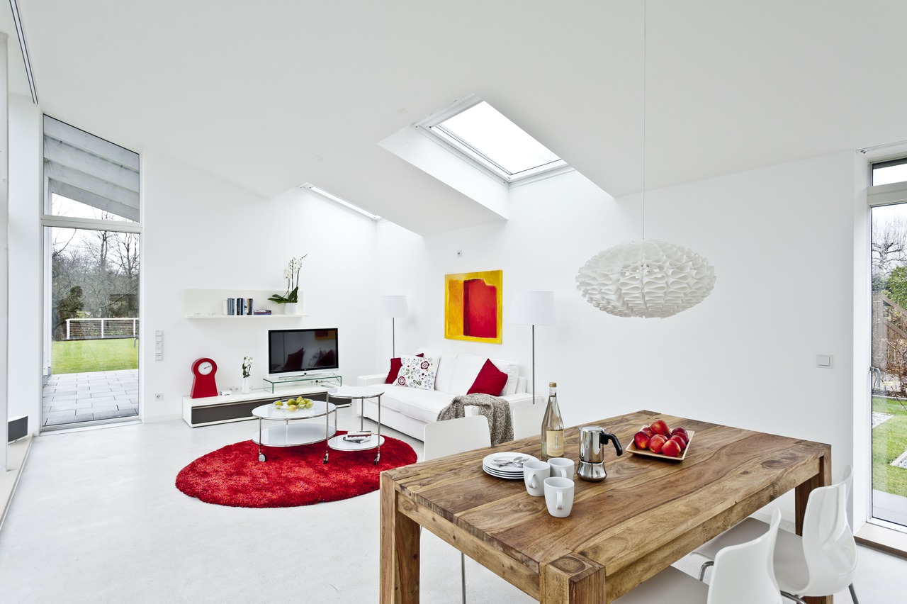 Una casa total white in cui gli unici tocchi di colore sono rossi. La luce delle molte finestre, fra cui due sul tetto, rende questo soggiorno molto luminoso. Gli oggetti colorati danno un’impronta molto personale a un arredamento minimale.