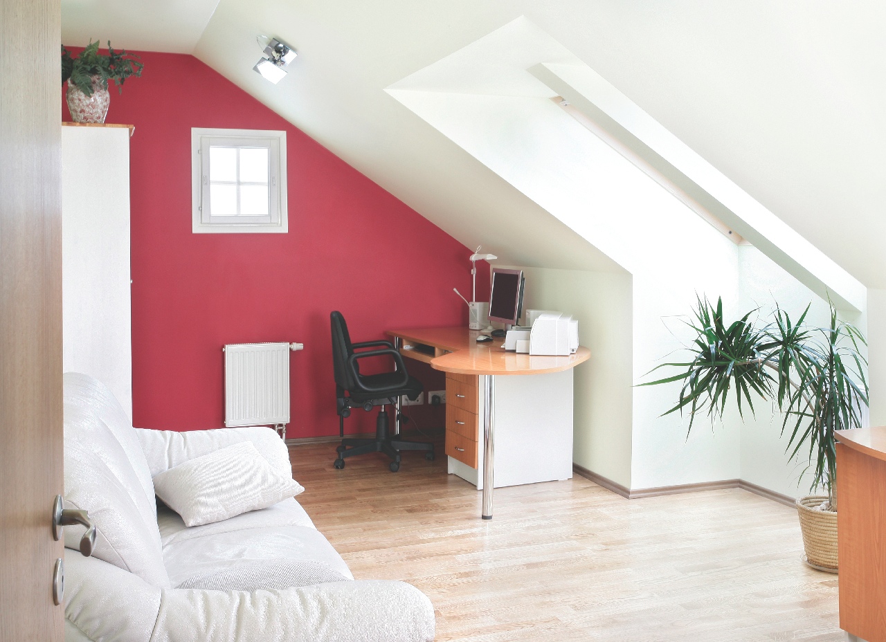 Un angolo studio nel sottotetto. Per ravvivare i mobili semplici e funzionali è stata inserita una parete rossa che segue la linea del tetto e crea un dettaglio insolito.