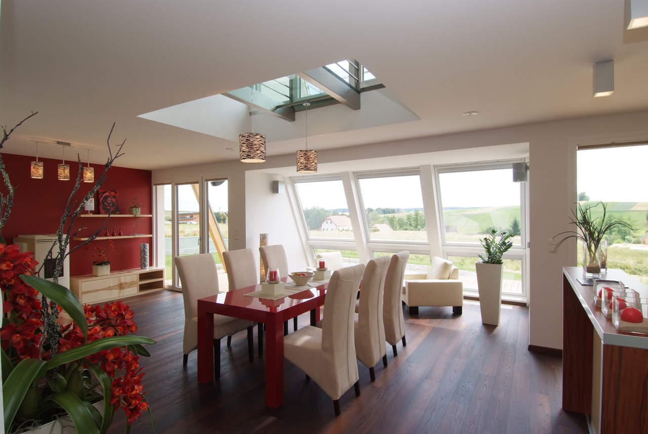 In questo open space luminoso il rosso si alterna al bianco. In questo modo si vivacizza il pavimento in legno scuro. Inoltre l’ambiente ha uno stile elegante e raffinato con un tocco originale che si ripete su tavola, parete, oggetti decorativi e piante fiorite.