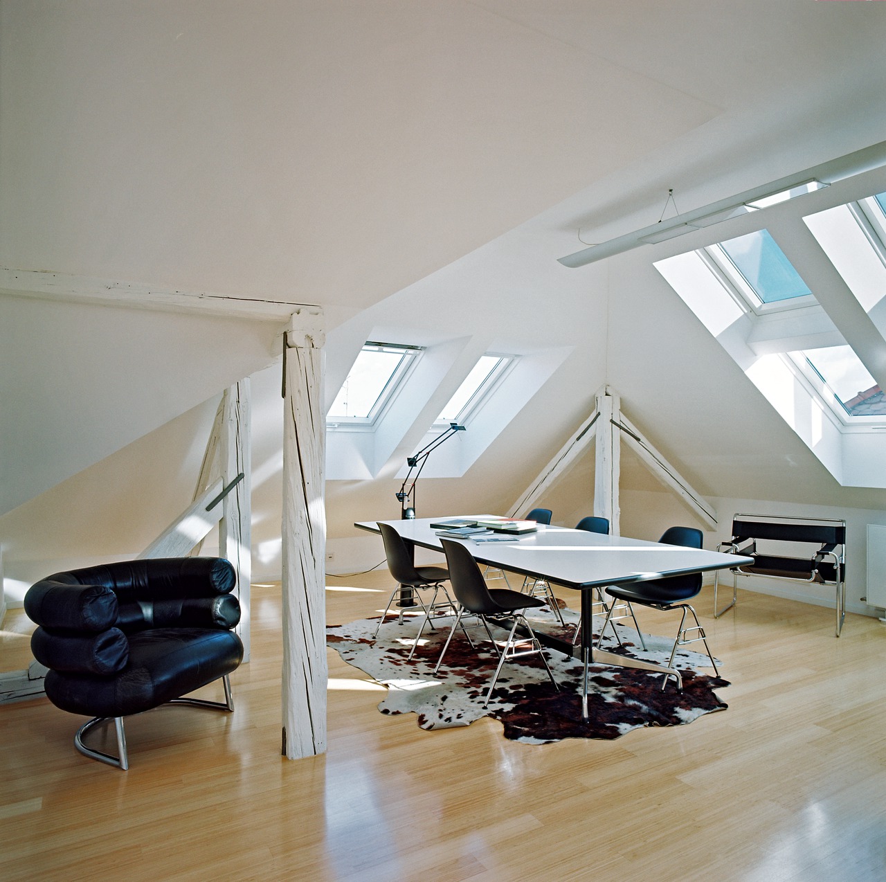 Una sala riunioni nel sottotetto. Le molte finestre per tetti e il pavimento in legno chiaro rendono l’ambiente molto luminoso. Alcuni oggetti di design, come il tappeto in pelle, le poltrone e la lampada da terra danno un tocco originale al tavolo e alle sedie semplici.