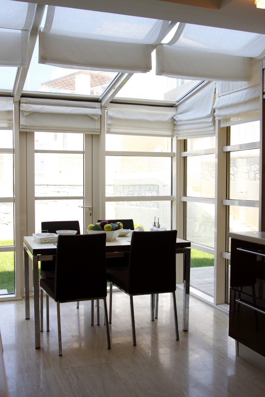 Questa zona pranzo è stata creata sulla superficie di una zona della casa trasformata in una serra bioclimamatica: le pareti sono delle vetrate con una portafinestra che dà sul giardino, il tetto è formato da finestre per tetti che possono essere aperte così da pranzare all’aperto in poche mosse. Lo stile è sobrio, con un tavolo moderno e delle poltroncine comode.