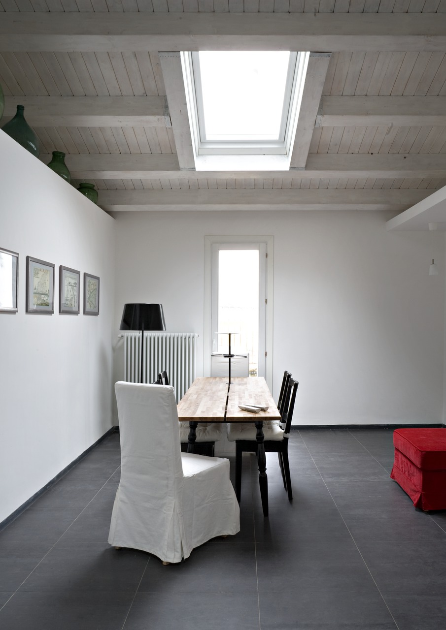 In questo sottotetto open space il tavolo in stile rustico è stato posizionato sotto la finestra per tetti, così da ricevere la luce del giorno. Per ampliare le dimensioni della stanza, le travi in legno del tetto sono state dipinte di bianco, così da contrastare con il pavimento a grandi piastrelle grigio scure. Il grosso pouf rosso dà un tocco di allegria alla stanza monocromatica.