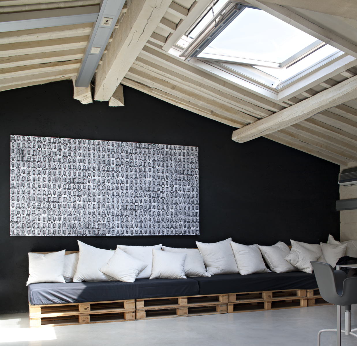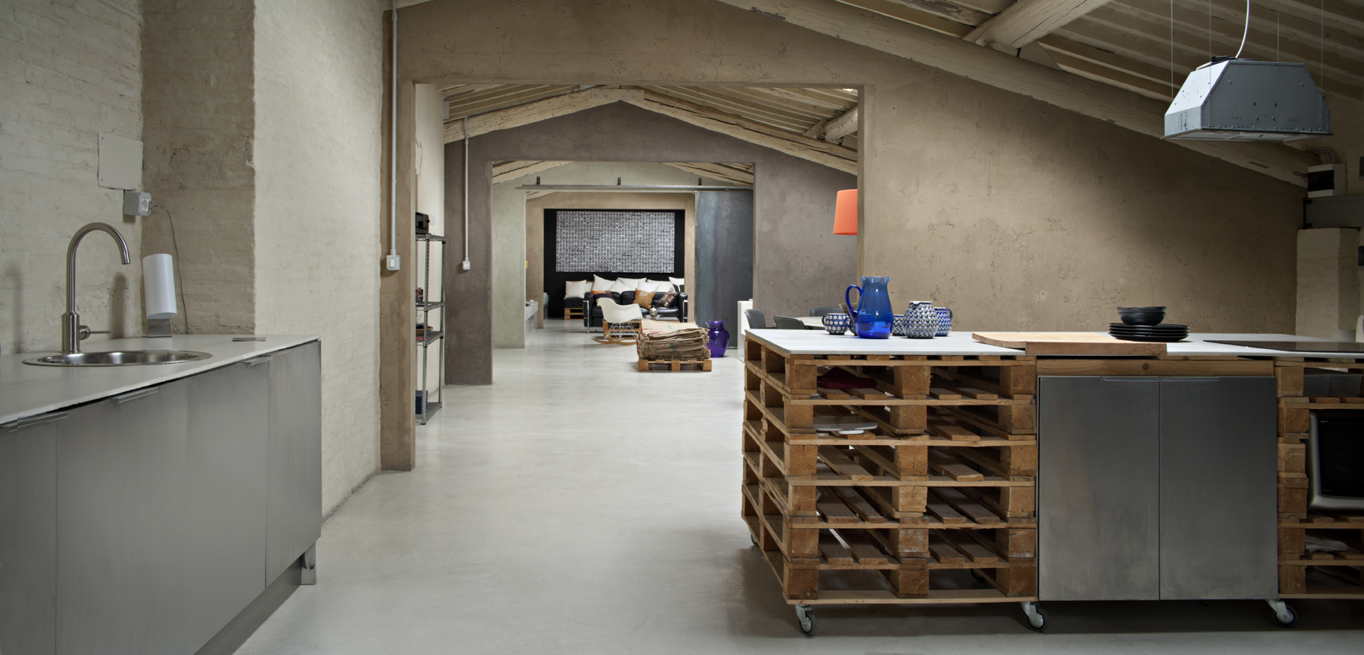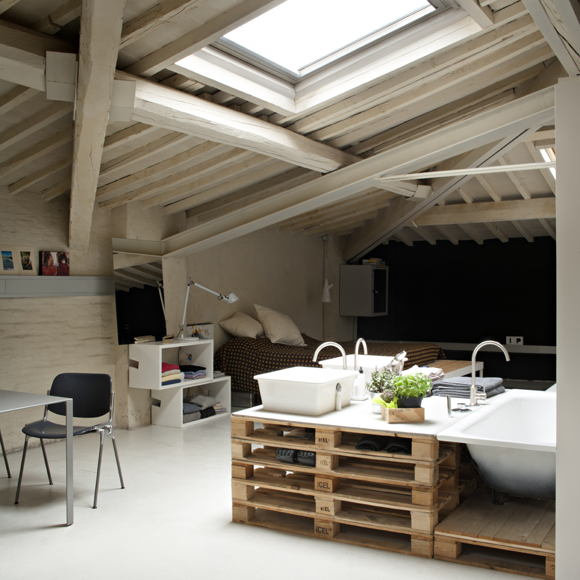 Il sottotetto dello stabile è stato recuperato e trasformato in uno spazio multifunzionale. Pochi ed essenziali gli arredi, però scelti con cura. Leitmotiv sono i pallets, che diventano divani, tavoli, basi per i sanitari o per il piano di lavoro della cucina. Lo spazio è un appartamento, ma anche un alloggio per gli ospiti di passaggio o un luogo dove organizzare piccoli eventi o riunioni di lavoro.
