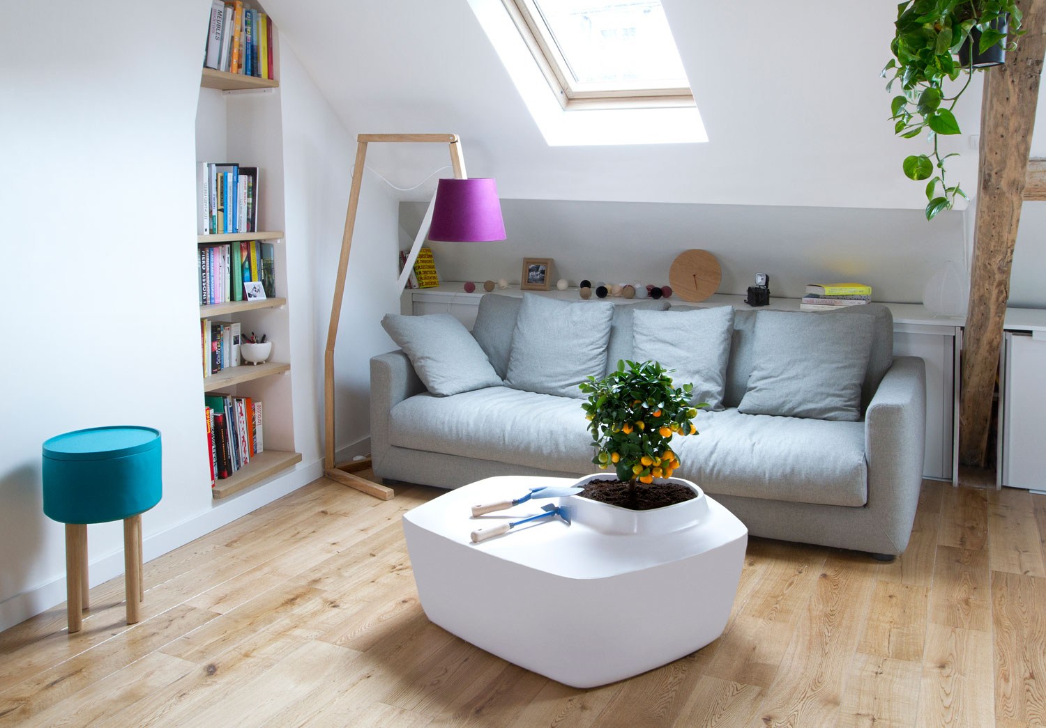 Non credete che ci sia abbastanza spazio in mansarda per mettere anche delle piante? Il tavolino ha il vaso incorporato e un vano porta oggetti. Un unico elemento con tre funzioni, che si inserisce benissimo in una mansarda con oggetti di design, come la lampada e il tavolino.