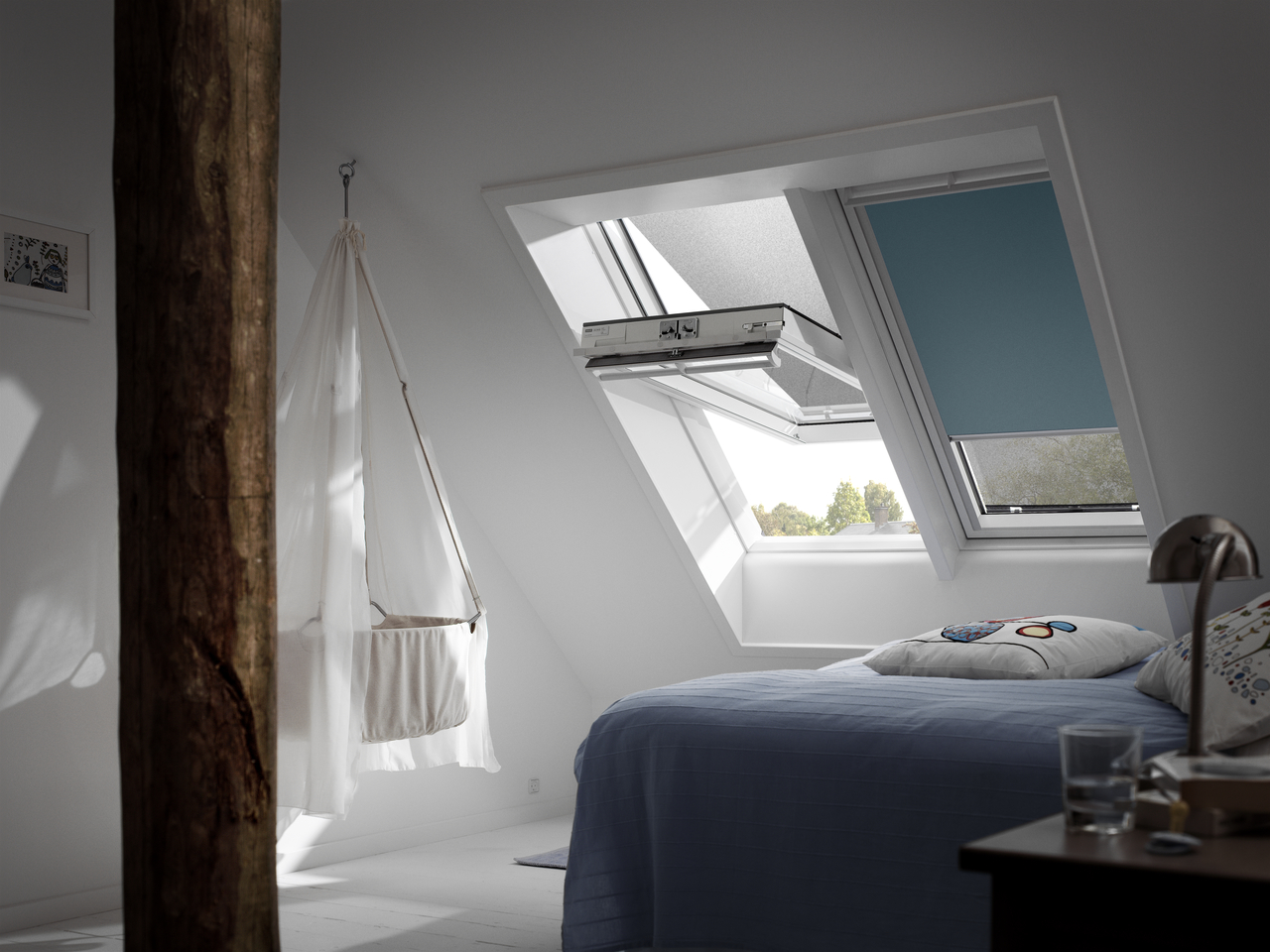 Le finestre per tetti VELUX permettono di scegliere varie soluzioni per l’oscuramento ottimale e parziale di una stanza, come le tende oscuranti a rullo e le tende oscuranti plissettate per interni e le tapparelle per esterni.