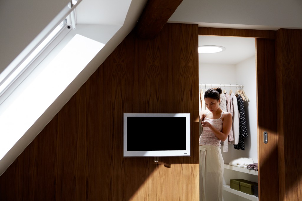 Per un sottotetto nel condominio o in una casa singola, la soluzione per aumentare la luminosità può essere quella di creare una terrazza a vasca o un patio interno con pareti interamente vetrate, dotate di serramenti apribili con vetrate basso-emissive e antieffrazione. Lo spazio al suo interno può essere utilizzato per allestire un giardino a uso esclusivo dell’abitazione.