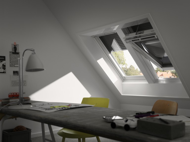 Per chi dispone di una finestra fuori portata, sono disponibili le versioni INTEGRA elettrica e INTEGRA solare. Entrambe vengono controllate tramite un controllo a distanza e possono essere gestite con VELUX ACTIVE per ridurre il caldo all’interno della stanza quando i parametri rilevati non sono ottimali.