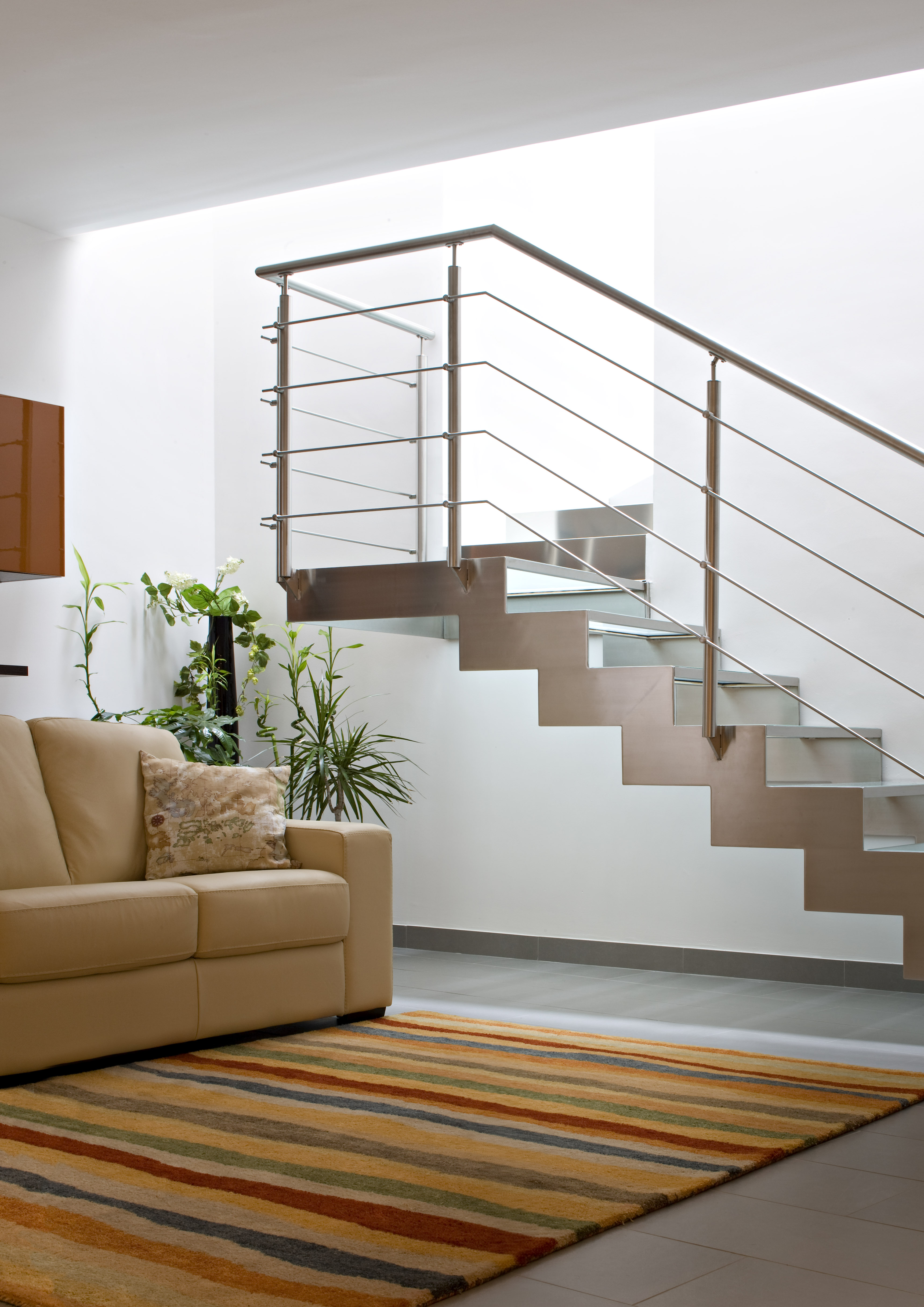Il piano superiore della casa, ricavato in seguito all’ampliamento dell’immobile, si raggiunge attraverso un corpo scala in vetro e acciaio, costruito in aderenza alla parete di spina che separa il soggiorno dalla cucina.