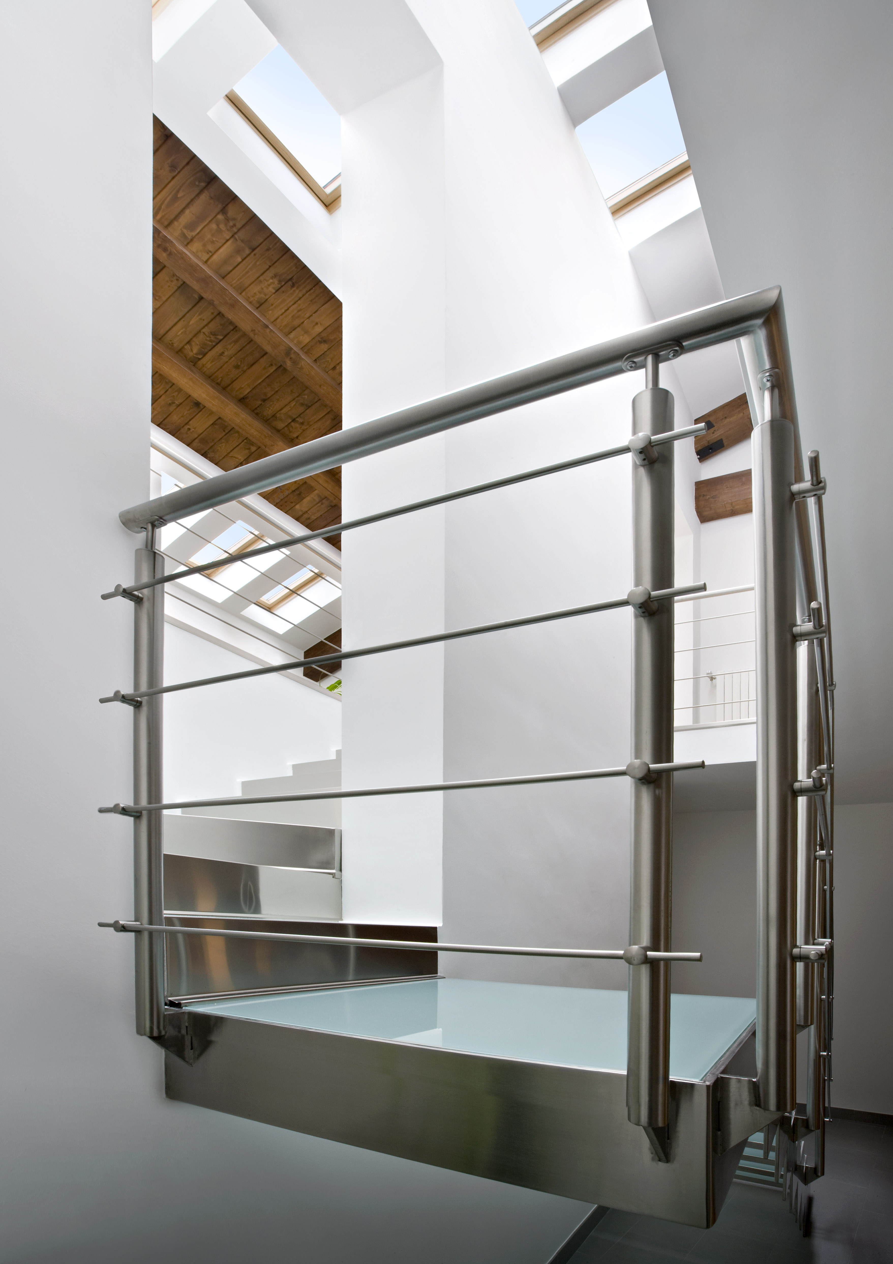 Sulla sommità del vano scala sono state posizionate sei finestre per tetti Velux elettriche e programmabili grazie a un semplice telecomando, che illuminano di luce naturale anche gli ambienti più interni del piano sottostante.