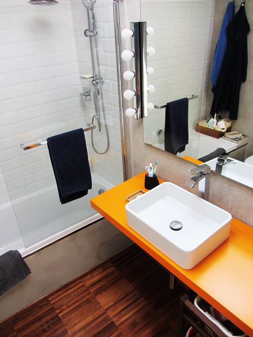La parete principale, ininterrotta dall’ingresso al fondo, è di un vivo color verde acqua. Il pavimento, in tutti gli ambienti, è un parquet industriale, resistente ed economico, al di sotto del quale è stato realizzato un vespaio areato, indispensabile per il nuovo uso residenziale. Il frassino del parquet, termo-trattato a 180°, si adatta all’uso del riscaldamento a pavimento, lasciando libere le pareti dai radiatori tradizionali.