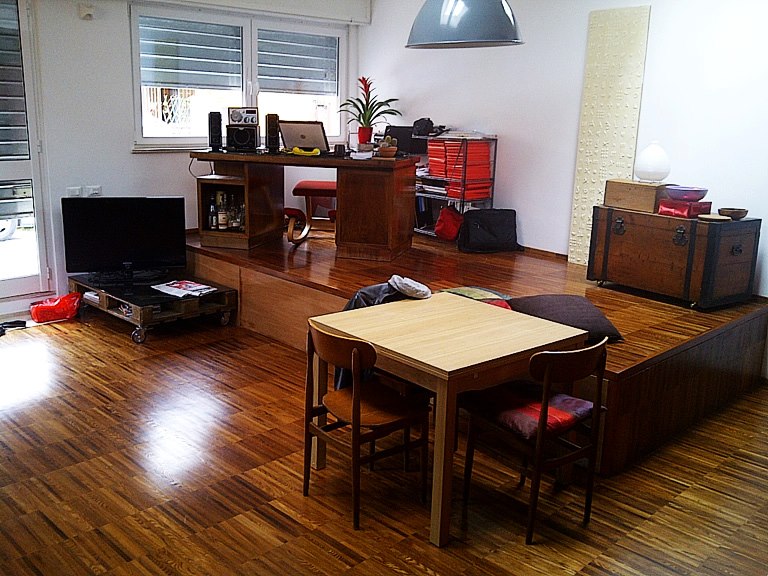 “L’ambiente principale di circa 35 mq – racconta l’architetto Camiz – è completato da una pedana rialzata, con una triplice funzione: zona studio, senza necessità di costruire pareti, ripostiglio per gli oggetti, che possono essere posti al di sotto della pedana e infine seduta per il tavolo da pranzo”.