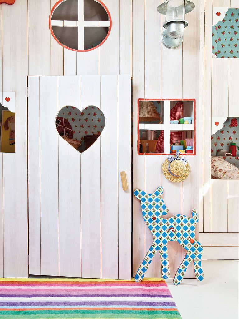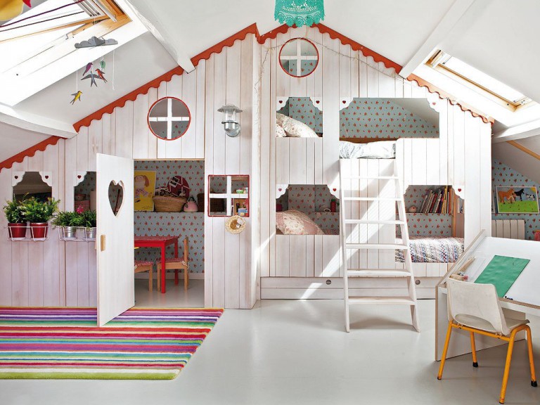 Un sottotetto trasformato nel sogno di ogni bambino, una casa tutte per sé in cui giocare e riposare. Infatti c’è una piccola zona giorno con una cucina giocattolo, un tavolino con due sedie e la cuccia per il gatto -finto- e una zona notte con un letto a castello.