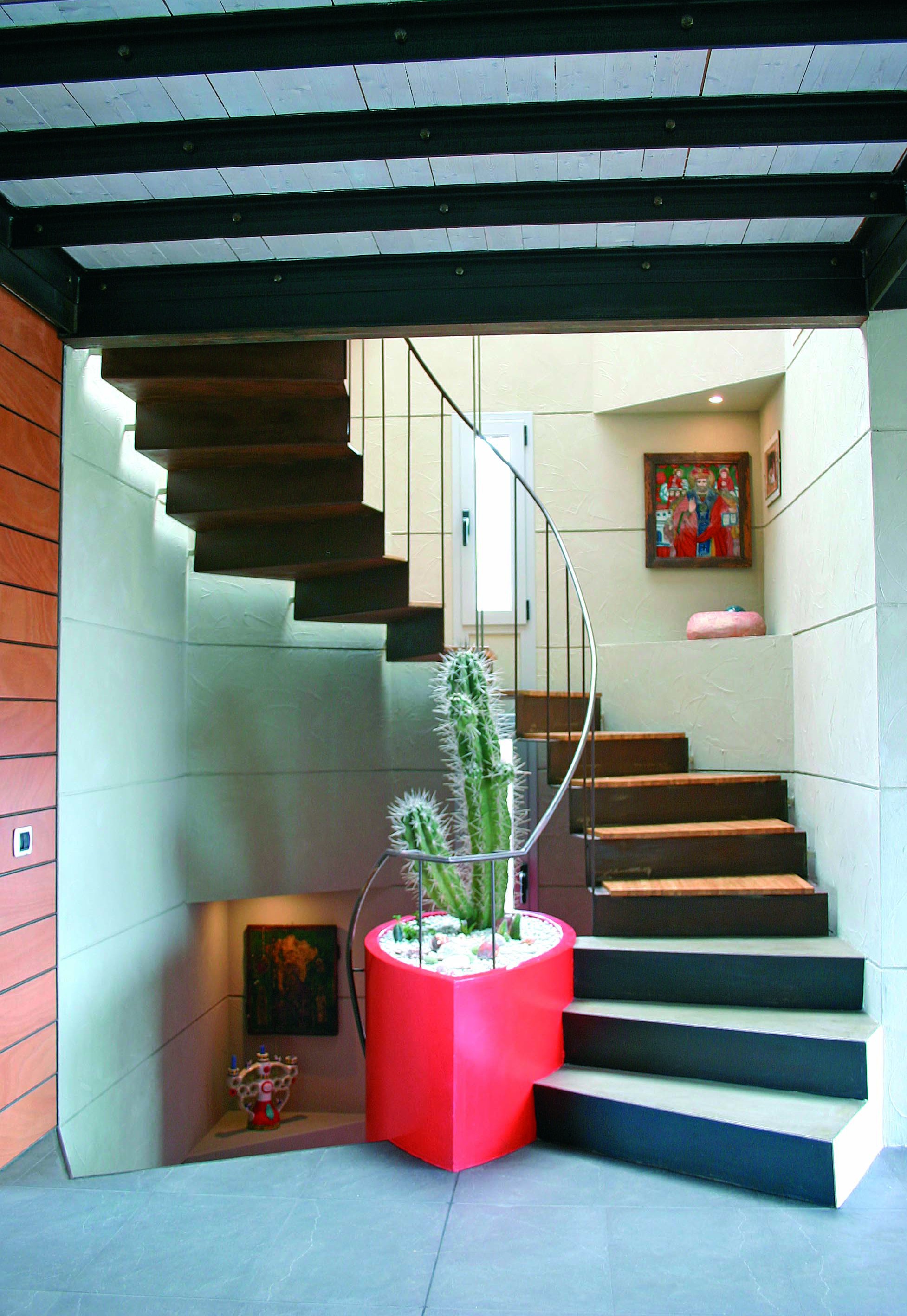 Al soppalco si accede tramite una scala dalla struttura leggera che al primo sguardo appare morbida e flessuosa, sospesa da un sottile filo d’acciaio.