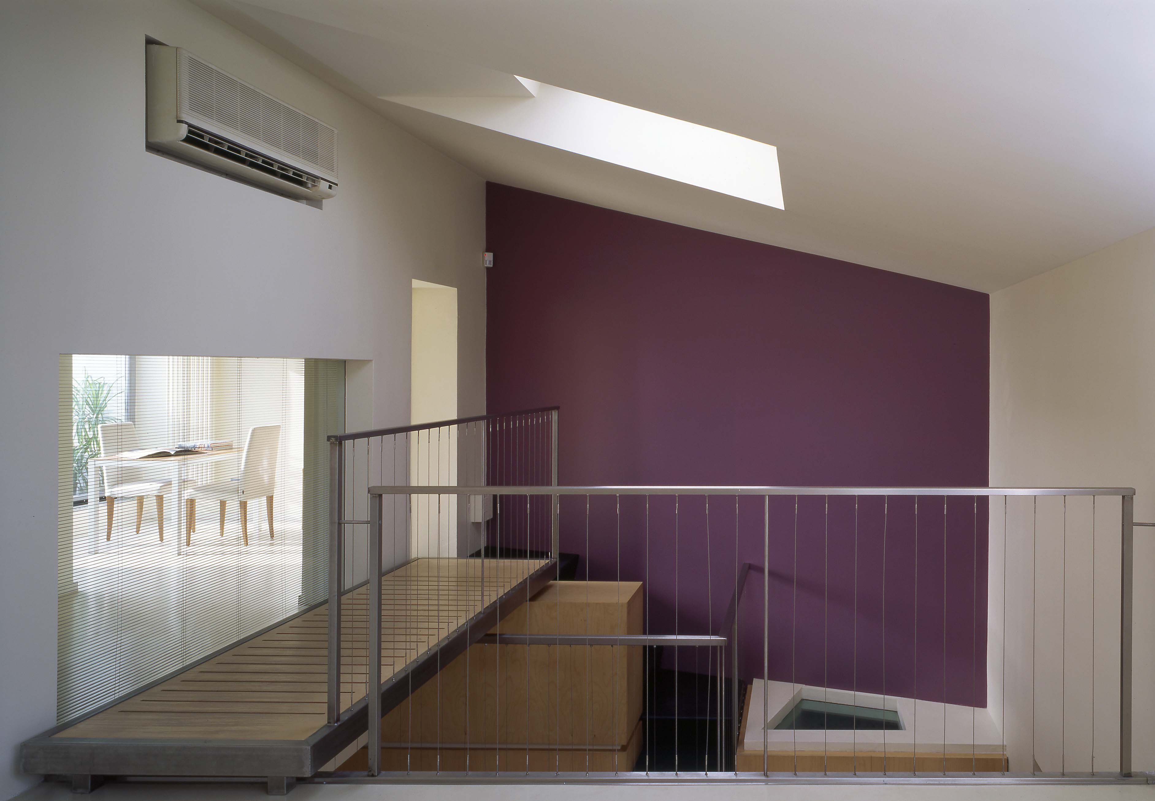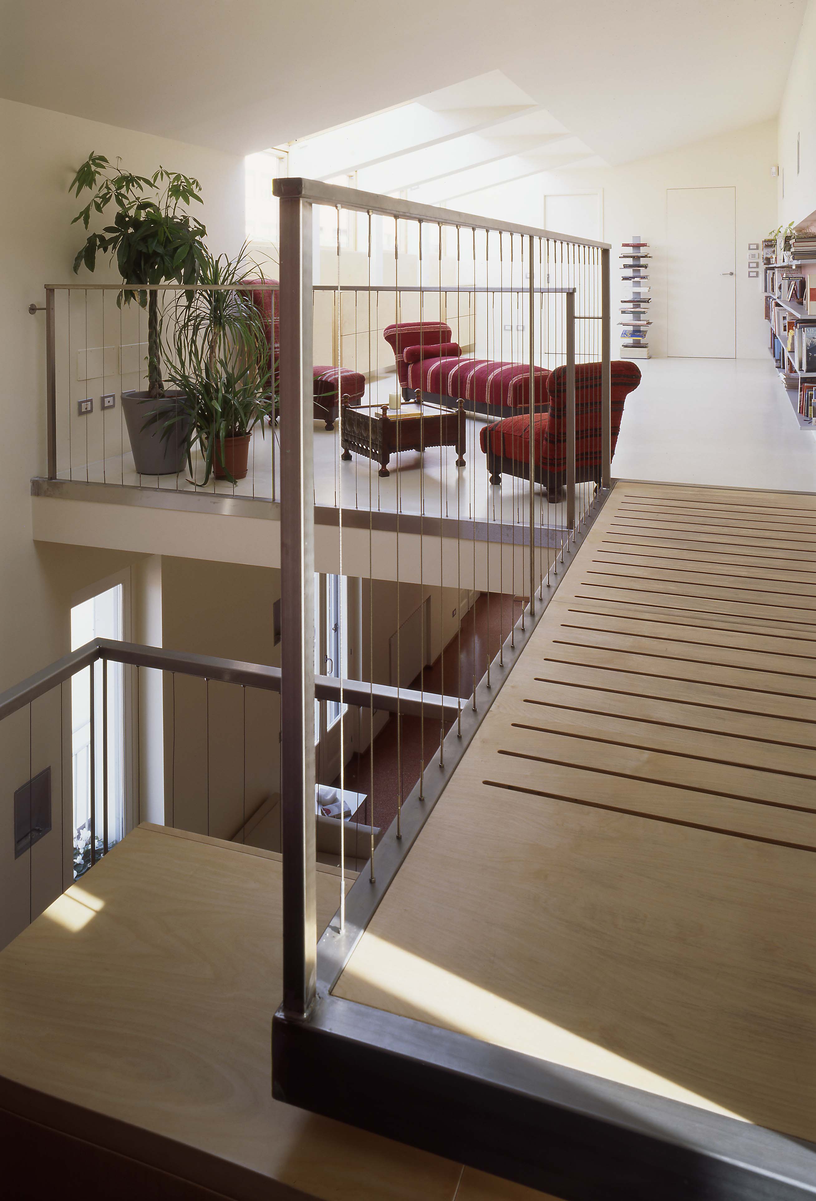 Nella zona a doppia altezza questa soluzione non è stata adottata ma è stata inserita una finestra automatizzata che illumina il locale sottostante e lascia filtrare la luce nella stanza da bagno. Inoltre è stato inserito un automatismo che aziona la finestra fuori portata, in modo che reagisca alle condizioni atmosferiche, garantendo la chiusura automatica in caso di maltempo.