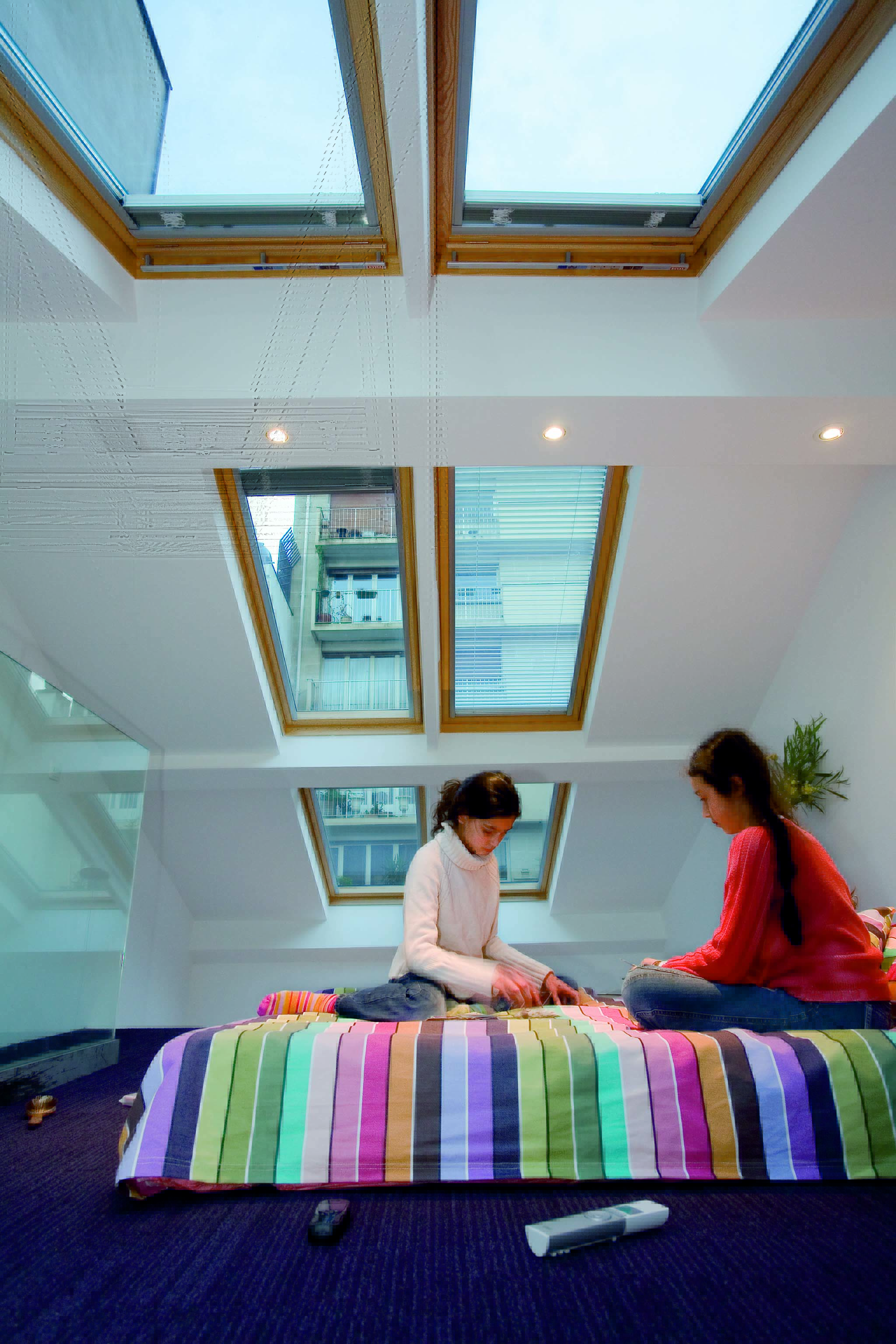 L’atelier è la parte che subisce la trasformazioni maggiori. Convertito in un open space su tre livelli, risulta straordinariamente luminoso, grazie alla creazione di un’ampia vetrata, realizzata con l’inserimento di 10 finestre per tetti VELUX elettriche.