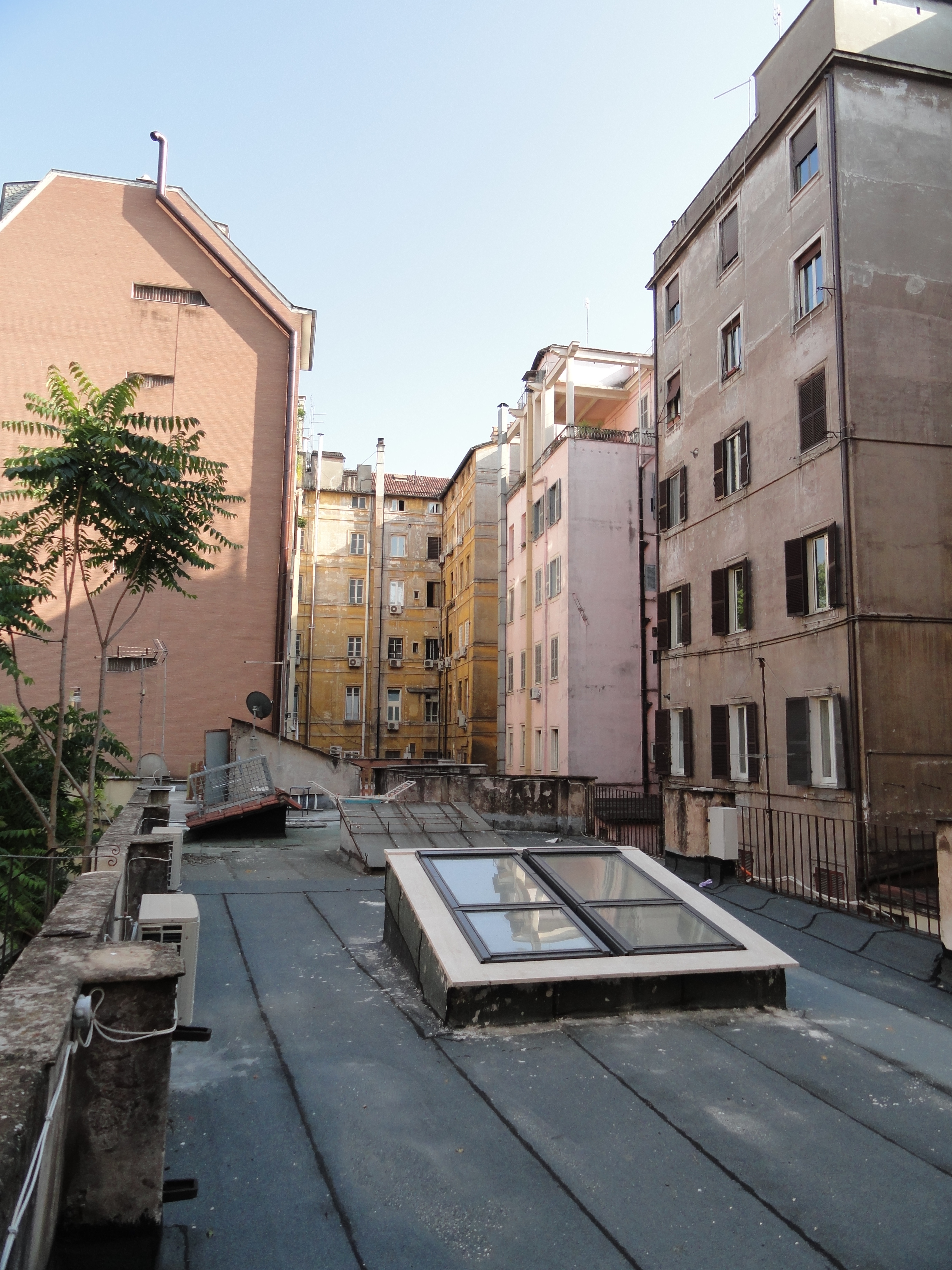 Il tetto dello stabile è piano, a terrazzo, e su di esso poggia un volume inclinato, sul quale già in origine si apriva un grande lucernario: una struttura artigianale, con vetri e telaio ormai consumati dal tempo e dall’incuria.