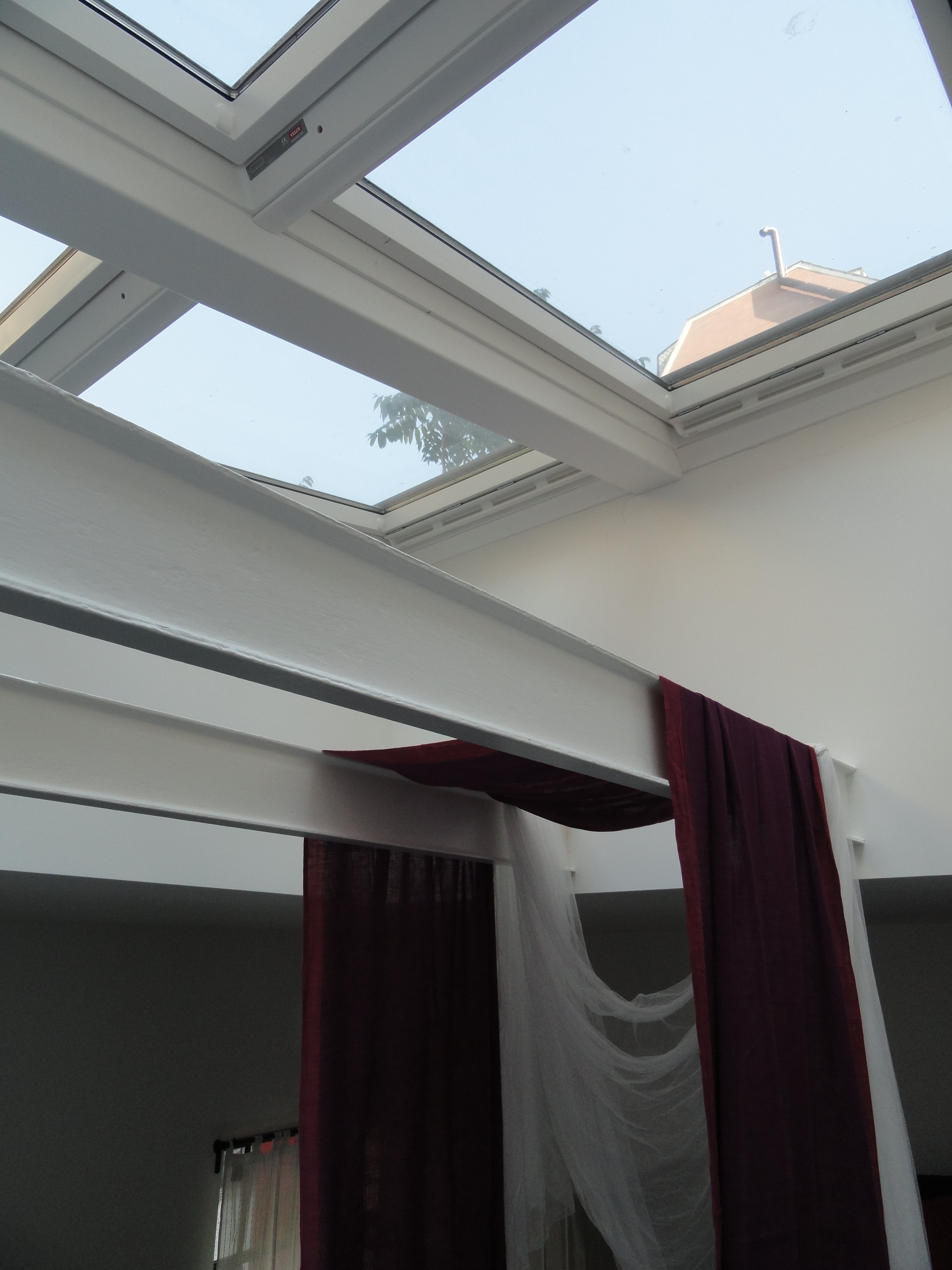 Le finestre sulle pareti verticali sono poche: complessivamente il volume dell’atelier risulterebbe piuttosto buio se non scendesse una vera e propria cascata di luce dal soffitto.