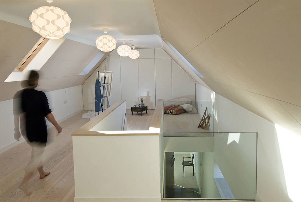 Per salire al piano superiore ci sono due scale. La scala di legno porta al sottotetto mansardato dove c’è un angolo per il relax e e uno studio: le finestre per tetti illuminano tutta la zona di lavoro. Lo stesso giroscale, che viene chiuso con due piccole balaustre in vetro, viene illuminato dalla luce naturale che arriva dall’alto.