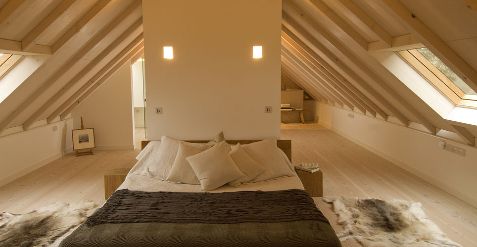 Dalla seconda scala, costruita all’interno di un ambiente circolare, in parte visibile dall’esterno della casa, si arriva alla zona notte, con la camera da letto matrimoniale e un bagno. In entrambe le stanze predomina il colore chiaro, con il tetto e il pavimento in legno naturale e le pareti color crema.