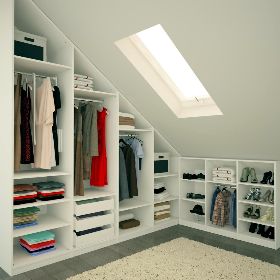 Il sogno di tutti, una cabina armadio ben strutturata con spazio per provare i vestiti. In questo caso il mobile segue il profilo del tetto utilizzando tutto lo spazio e la finestra fa entrare la luce naturale, così da illuminare tutto.