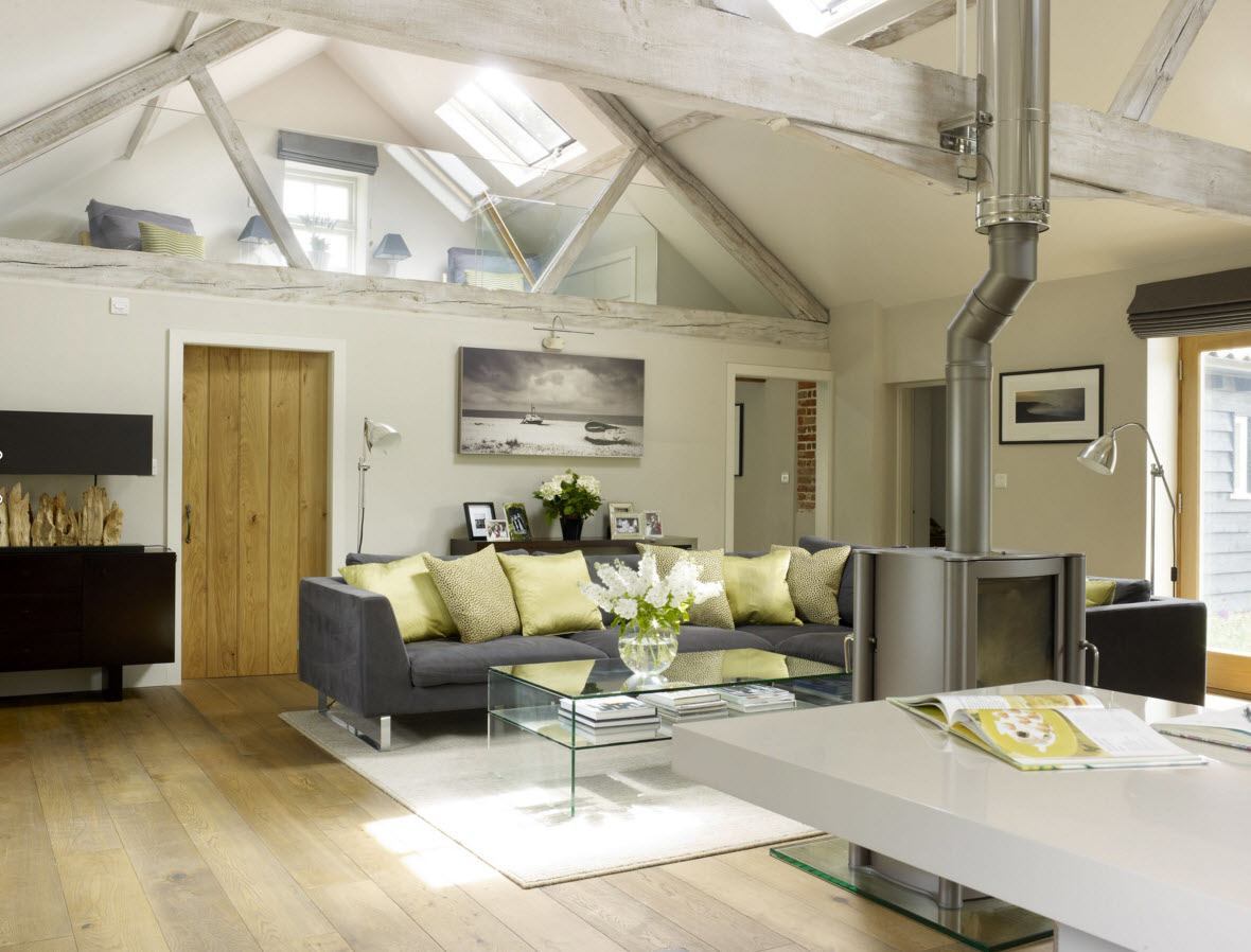 La ristrutturazione di questo edificio ha trasformato un vecchio caseificio in una casa moderna. Le travi dei tetti sono quelle originali e sono state restaurate per collegare il vecchio al nuovo. Il soppalco illuminato dalle finestre per tetti è stato trasformato in un angolo appartato, ma con vista sulla zona giorno.