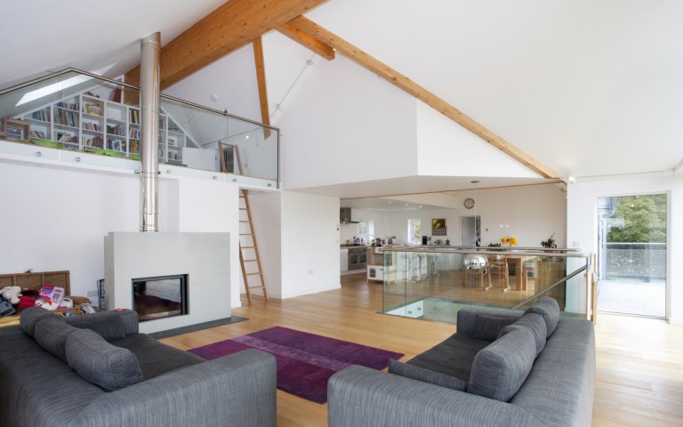 Questa casa in Cornovaglia ha un design contemporaneo, con interni spaziosi e una scala centrale che, con le sue balaustre in vetro e i gradini flottante, convoglia la luce. Il piccolo soppalco, anch’esso con la balaustra in vetro, viene illuminato da una finestra per tetti e crea un angolo biblioteca, con la libreria che segue il profilo dello spiovente.