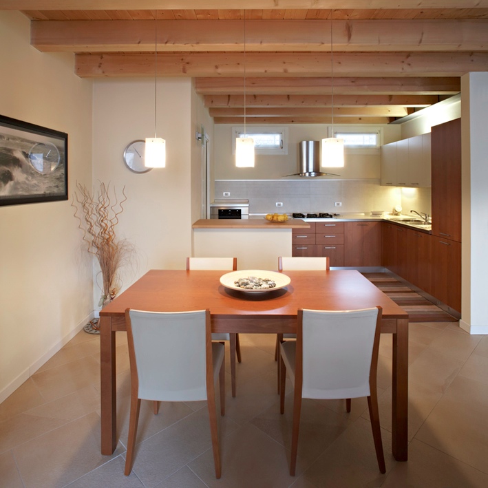 I pavimenti in gres tinta crema della zona giorno creano un piacevole cromatismo con il parquet in faggio della zona notte e i serramenti verticali in legno laccato bianco.