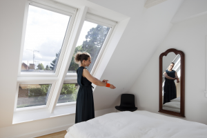 In camera da letto le finestre per tetti sono il modo migliore per aumentare la privacy, controllare il ciclo del sonno, con luce di giorno e oscuramento di notte, e ventilare la stanza.